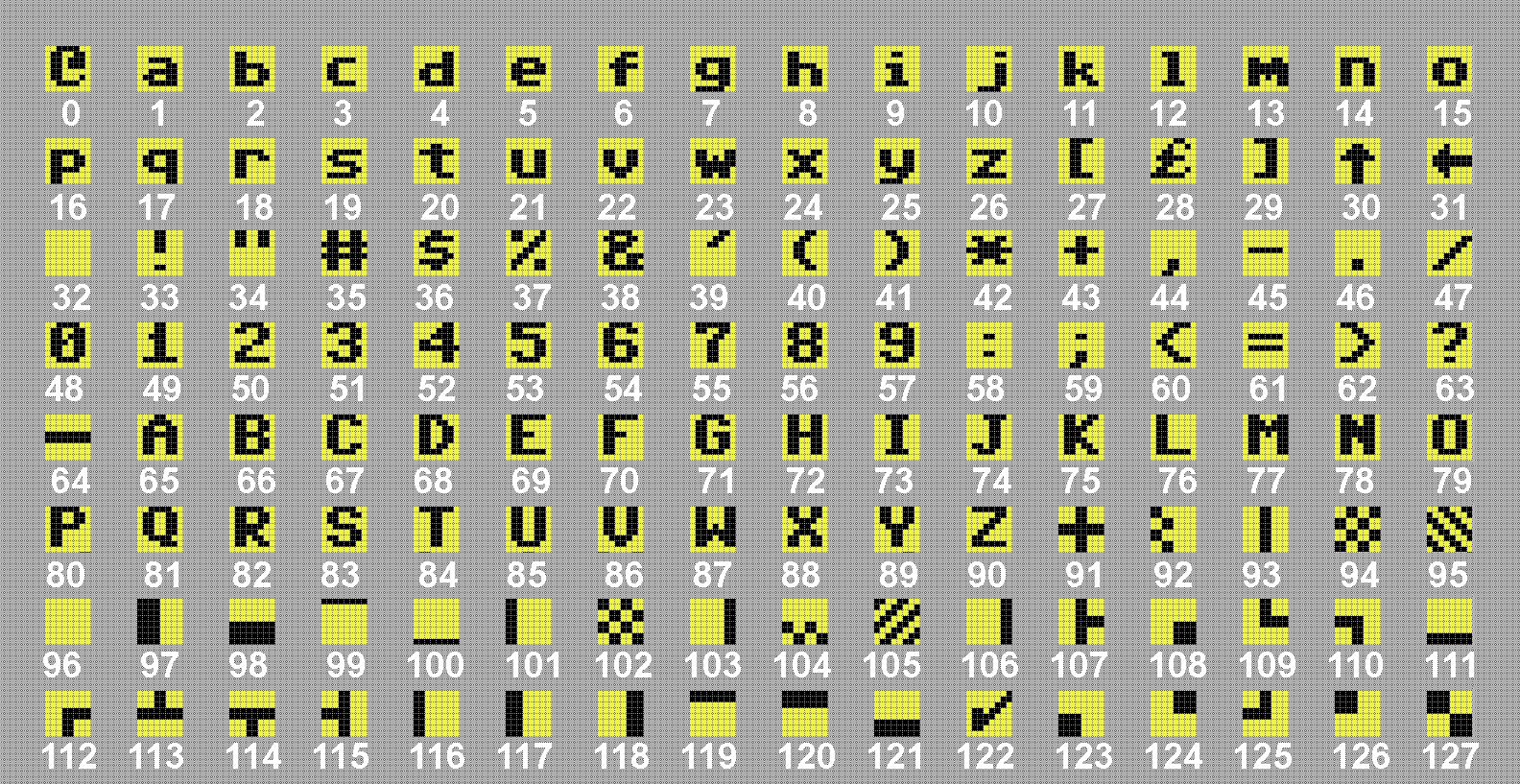 | aktuell | 10:39, 7. Jan. 2022 | 1.584 × 817 (26 KB) | Petrus (Diskussion | Beiträge) | Zeichen und Bildschirmcodes 0-127 Zeichensatz 2 | |