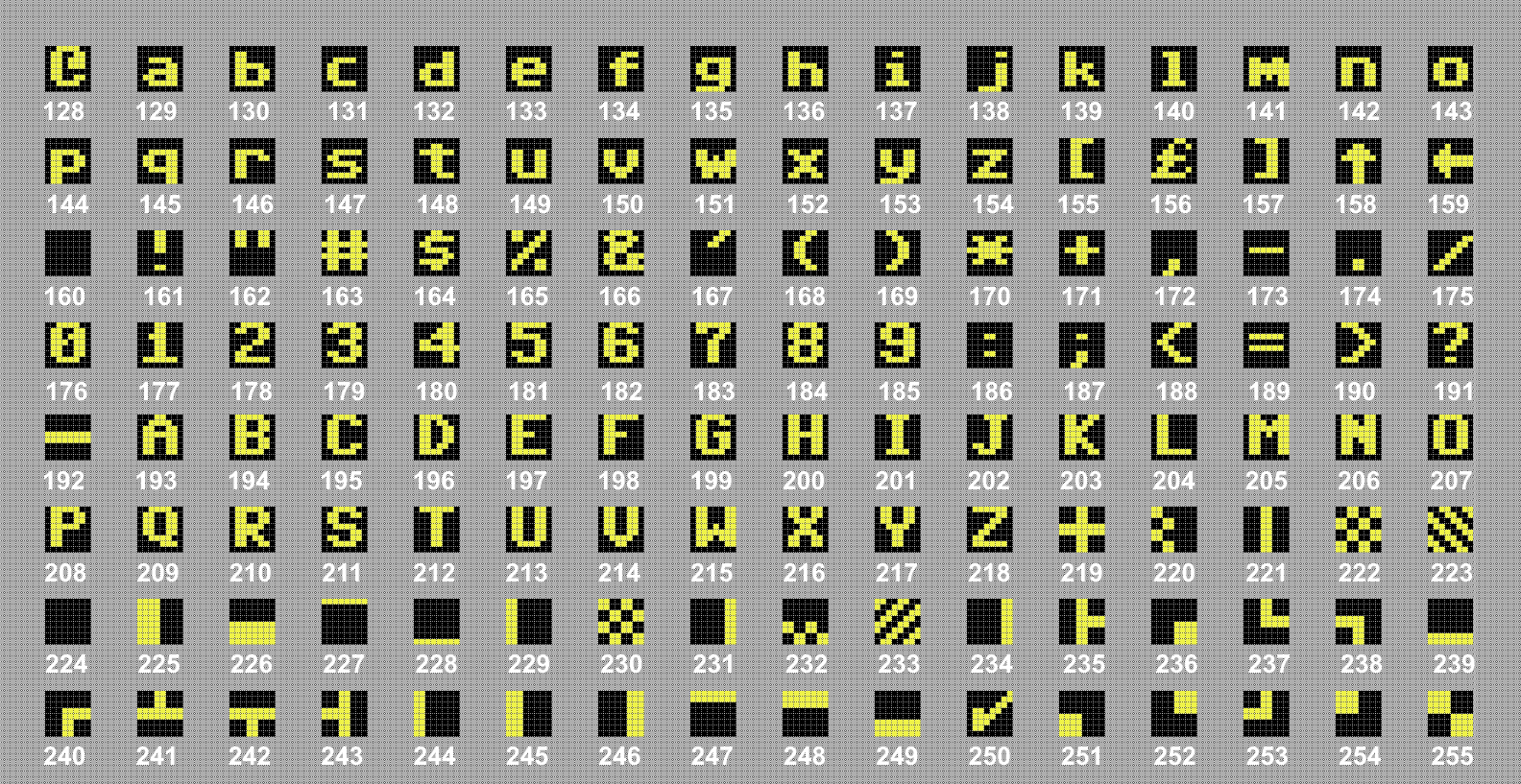 | aktuell | 10:40, 7. Jan. 2022 | 1.584 × 817 (31 KB) | Petrus (Diskussion | Beiträge) | Zeichen und Bildschirmcodes 128-255 Zeichensatz 2 | |