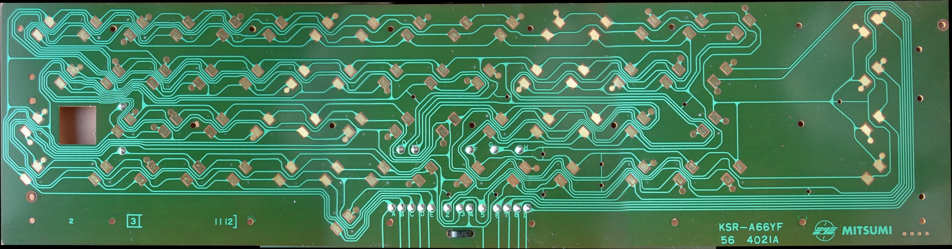 Selbstgemachtes Foto (aus drei Einzelfotos zusammengesetzt) einer Tastatur-Platine, Baujahr 1983 (Tastatur mit grauen F-Tasten)