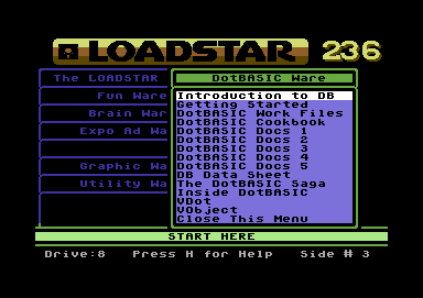 - (DotBASIC ist eine Erweiterung zu BASIC 2.0 zum visuellen Gestalten des Bildschirms, es bietet Maus-Kontrolle, Menüs, scrollende Menüs, Ausschneiden/ Einfügen, Kästen und DO-Schleifen. Anders als die meisten Basic-Erweiterungen versetzt DotBASIC den Computer in seinen ursprünglichen Zustand zurück, wenn es beendet wird. - Die Loadstar-Oberfläche wird mit DotBASIC gemacht.)