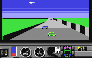 Das Spiel hat eine bewegte Farbgrafik im Rennen (ca. 3/4 des oberen Bildschirms), die insgesamt lieblos wirkt. Die Rennen unterscheiden sich optisch kaum voneinander. Unten sind Gangschaltung, Tempo und Schaden am Auto dargestellt, letzteres sehr einfach gehalten.