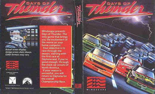 Mindscape präsentiert "Tage des Donners". Das einzige Spiel, das Ihnen die Aufregung des Films auf Ihren Heimcomputer bringt. Ihr Ziel ist es Rennen durch die komplette Saison zu fahren. Beginnend mit dem Rennen in Daytona und wenn Sie gut genug sind, durch die Stock-Car-Rennstrecken von Nordamerikas. Wenn Ihre Saison erfolgreich ist, werden Sie nach Daytona zurückkehren für das entscheidende Meisterschaftsrennen.