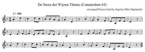 Das nachfolgende Bild zeigt die Begleitmelodie des Spiels in der üblichen Notenschreibweise. Für eine kreative Weiterverwendung der Melodie stehen die Noten auch als PDF-Dokument (Datei:DeSteenDerWijzen Theme PDF.pdf) und in der ABC-Musiknotation (Datei:DeSteenDerWijzen Theme.abc.txt) zur Verfügung.