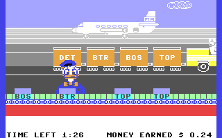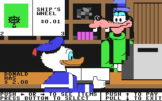 Wenn Sie sich auf der Mainstreet befinden, können Sie Donald in 7 verschiedene Gebäude oder in den Park am Ende der Straße bewegen (Donald folgt der Joystickbewegung). Wenn Sie McDuck Airlines, The Produce Market, The Toy Store oder AMQUACK Railroad (die Gebäude auf der rechte Seite) wählen, werden Sie angestellt. Geben Sie die Anzahl der Minuten ein, die Sie arbeiten wollen (Joystick vor/zurück, Feuerknopf zum Bestätigen), danach können Sie beginnen (Ach, wenn das in der Wirklichkeit auch so einfach wäre... ;) )
