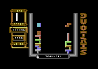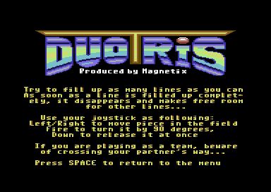 Duotris ist ein Clone von Tetris für zwei Spieler am C64. Das altbekannte Ziel ist möglichst viele Punkte zu erlangen, indem man, von oben fallende, Spielsteine auf dem Spielfeld so platziert, dass horizontal möglichst lückenlose Reihen entstehen. Sobald eine oder mehrere Reihen durch einen Spielstein komplettiert wurden, verschwinden sie und die darüber liegenden Steine fallen nach unten nach.