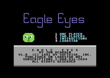 Eagle Eye ist ein Spiel aus der Loadstar-Reihe, das auf der Ausgabe 087 enthalten ist. Es erfordert wie der Name schon sagt "Adleraugen". Das Spiel kann alleine oder gegen einen zweiten Spieler gespielt werden. Die Aufgabe besteht darin, in der vorgegebenen Spielzeit je Level fünf gleiche Flächen zu finden. Dazu hat man drei Leben zur Verfügung. Die vorgegebene Spielzeit ist im ersten Level noch recht großzügig. Von Level zu Level verringert sich dabei die Zeit, so dass man dadurch immer mehr unter Zeitdruck gerät.