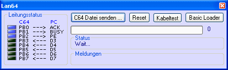 Bei Problemen bei der Verbindung zum C64 kann ein Kabeltest durchgeführt werden, um zu prüfen, ob alle Drahtverbindung im Kabel in Ordnung sind. Hierzu muss die Schaltfläche Kabeltest betätigt werden. Es erscheint ein Fenster mit einer BASIC-Programmliste die in den C64 abgetippt werden muss. Das Programm wird mit RUN gestartet. Wurde das Programm richtig abgetippt, erscheint die Meldung "ALLES OK". Jetzt muss SYS49152 in den C64 eingegeben werden. Auf dem PC muss nun die Schaltfläche OK betätigt werden und der Kabeltest wird gestartet.