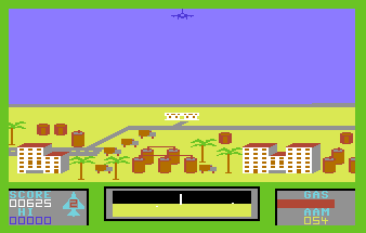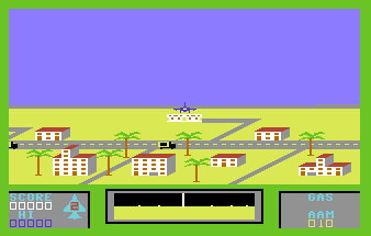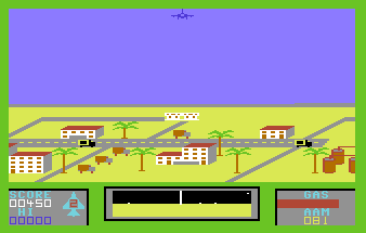 Der eigene und die feindlichen Jets bestehen aus einfarbigen hochauflösenden Sprites mit nur wenigen Animationsframes, und unterscheiden sich lediglich durch ihre Farbe. Ähnlich wie bei Defender wird die Landschaft, wenn auch arg ruckelig, in zwei Richtungen gescrollt und wiederholt sich nahtlos aufgrund der geringen Ausmaße von nur ca. sechs Bildschirmen relativ schnell. Dass sich das Geschehen offenbar in einer Wüstenlandschaft abspielt, womöglich in einem Ölförderungsgebiet wie etwa dem Nahen Osten, wird durch die Gelbfärbung des Bodens, einige Palmen und Öltanks hinreichend dargestellt. Rechtwinklig verlaufende Straßen, kantige Gebäude und unanimierte, wie fluchtartig verlassen erscheinende LKWs wirken wenig überzeugend. Beim Beschießen der Jagdbomber zeigen sich zudem deutliche Schwächen bei der Kollisionsabfrage, wenn die eigenen Raketen wirkungslos durch die Gegnersprites passieren, was umgekehrt selbstverständlich niemals vorkommt. Ein starkes Trägheitsmoment erschwert zudem die Steuerung, d.h. der eigene Jet braucht einige Sekunden um einen kompletten Richtungswechsel durchzuführen.