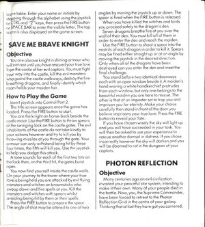 Der Spielesammlung "Fantasy Five" liegt eine insgesamt 8-seitige Bedienungsanleitung bei. Das folgende Bild zeigt die Benutzerhinweise zum Spiel "Save Me Brave Knight". Die vollständige Anleitung findet sich hier: Datei:FantasyFive Manual.pdf.