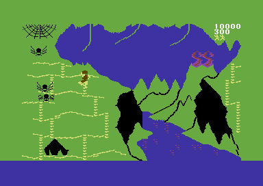 Kurz nachdem das Spiel begonnen hat, tritt die Spielfigur aus der Höhle unten hervor. Der Spieler muss nun versuchen über die gelben Steinpodeste an den Spinnen vorbei und über die Lianen auf die andere Seite zu gelangen. Auf der einen Seite besteht die Gefahr von den Spinnen berührt zu werden, auf der anderen Seite in die Tiefe zu stürzen. Die Spinnen benutzen die Wege auf den Plateaus und klettern die Stufen hinab. Die einfachste Methode, die Spinnen zu überlisten ist, die Spinnen in eine Ecke zu lotsen und dann schnell auf die andere Seite zu springen und nach oben zu klettern. Die Spinnen folgen nämlich der Richtung, wo sich die Spielfigur gerade befindet. Außerdem ist es besonders ratsam, nie nah unter einer Spinne sich zu bewegen, da sonst die Spinne ganz plötzlich nach unten springt und es kein Entrinnen gibt. Eine weitere Methode die Spinnen zu überlisten ist, in eine Richtung zu laufen und dann einfach nach links oder rechts darüberzuspringen. Befindet sich eine Spinne am Boden, erscheinen aus dem oberen Spinnennetz neue Spinnen. Diesen Zeitraum sollte man nutzen, um auf die erste Liane zu springen, sofern man sich auf der obersten Ebene befindet. Schlägt die zweite Liane nach links aus, sofort weiterspringen. Bei der dritten Liane wiederholt man diesen Vorgang bis man die andere Seite erreicht hat (immer möglichst lange den Feuerknopf beim Sprung gedrückt halten). Danach nur noch nach unten klettern und es öffnet sich das nächste Gebiet.