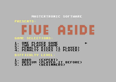| Information | Es wurden zwei Versionen des Spiels veröffentlicht: Die eine nennt sich "Five-a-Side Soccer", die andere "Five-a-Side Football". | |