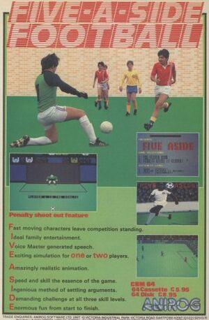 Das Spiel wurde 1985 zunächst im Vereinigten Königreich unter dem Namen Five-a-Side Football von Anirog UK veröffentlicht. Die Namensgebung ist aber auch innerhalb des Spiels selbst nicht konsistent. Im Ladebildschirm des C64 wird das Spiel, ähnlich wie die DOS-Version, als Five A Side Indoor Soccer betitelt. Im Hauptmenü nur mit der Kurzbezeichnung FIVE ASIDE bezeichnet. [1]