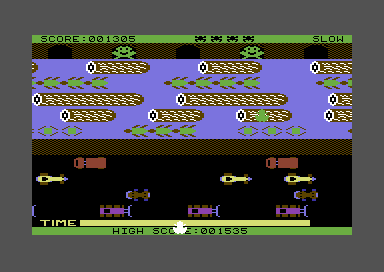 Das Spiel zeigt immer den gleiche Bildschirmaufbau: im unteren Teil die Straße mit Autos und im oberen Teil den Bach mit Baumstämmen, Schildkröten, Krokodilen und Wasserschlangen. Über diese Hindernisse bewegt sich der Frosch animiert. Es gibt Sounduntermalung, sowie eine nette Hintergrundmusik.