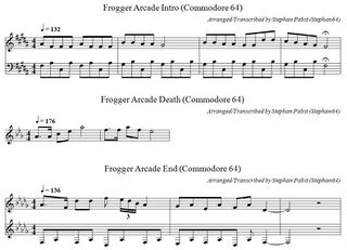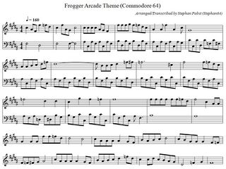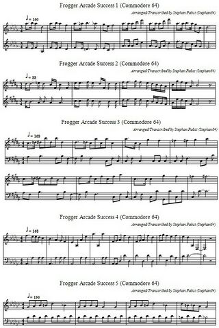 Das linke Bild der nachfolgenden Galerie zeigt die musikalische Untermalung des Spiels in der üblichen Notenschreibweise. Zusätzlich erklingt noch je eine kurze Sequenz beim Beginn und beim Ende des Spiels sowie beim Verlust eines Lebens (mittleres Bild). Schließlich wird noch jeder der maximal 5 Frösche, der seinen Platz am oberen Bildschirmrand erreicht, dort mit einer eigenen Melodie begrüßt (rechtes Bild). Für eine kreative Weiterverwendung aller Melodien stehen die Noten auch als PDF-Dokument (Datei:FroggerArcade Theme PDF.pdf) und in der ABC-Musiknotation (Datei:FroggerArcade Theme.abc.txt) zur Verfügung.