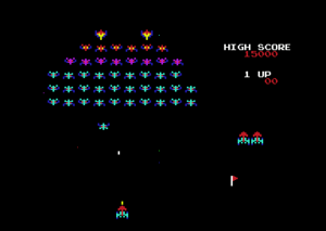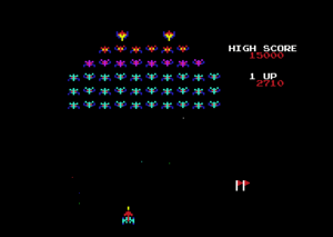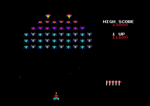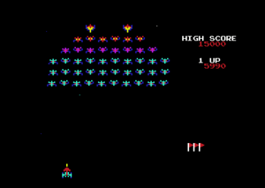 Die Raumschiffe in Vogelform befinden sich am oberen Bildschirmrand und wandern langsam von links nach rechts und zurück... Des öfteren lösen sich Raumschiffe aus dem Konvoi und fliegen Angriffe auf Dein Verteidigungsraumschiff, dabei wird geschossen oder auch a la Kamikaze direkt das Raumschiff angegriffen wird. Du kannst entweder die Angreifer abschießen oder ausweichen. Ein Level ist vorbei, wenn alle feindliche Raumschiffe abgeschossen worden sind. In jedem Level erhöht sich die Geschwindigkeit und Bewegung der Raumschiffe, sowie die Anzahl der simultaner Angriffe...