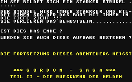 Bei Gordon Saga handelt es sich um ein Adventure mit Raumgrafiken aus PETSCII-Zeichen. Der Markt&Technik-Verlag veröffentlichte das Spiel von Michael Nickles unter dem Label Happy Software.