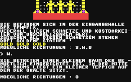 - Alle Textein- und ausgaben erfolgen in Deutsch. Allein dieser Umstand hebt dieses Spiel von vielen anderen, die meist in Englisch geschrieben sind, ab. Das Spiel akzeptiert sogar ganze Sätze. So könnte eine Anweisung zum Beispiel lauten: NIMM DAS SCHWERT UND GEH NACH NORDEN. Wird eine Eingabe trotz des recht großen Wortschatzes nicht verstanden, so meldet dies der Computer. Anweisungen, die er versteht, im Moment aber sinnlos sind, ignoriert er. Man kann allerdings, sofern man Lust dazu hat, zum Beispiel singen, beten oder warten, ohne dass dies den Spielablauf beeinflusst.