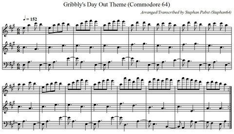 Das nachfolgende Bild zeigt die Titelmelodie in der üblichen Notenschreibweise. Für eine kreative Weiterverwendung der Melodie stehen die Noten auch als PDF-Dokument (Datei:GribblysDayOut Theme PDF.pdf) und in der ABC-Musiknotation (Datei:GribblysDayOut Theme.abc.txt) zur Verfügung.