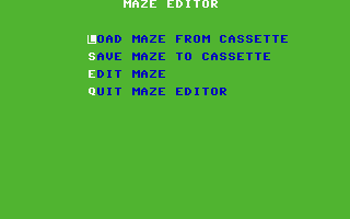 Besonders interessant, aber nicht notwendigerweise selbsterklärend ist natürlich der Menüpunkt "EDIT". Wählt man diesen aus, so erscheint zunächst die Frage, welches der vier benutzerdefinierten Labyrinthe man editieren möchte, und ob ein eventuell bereits existierendes Labyrinth zunächst löschen möchte, bevor man mit dem Editieren beginnt. Beantwortet man die zweite Fragem mit "N", so kann man nachträgliche Korrekturen an einem bereits existierenden Entwurf vornehmen.