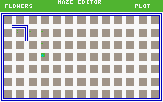 Sind alle Wände, die das Labyrinth besitzen soll, eingezeichnet, so wechselt der Editor nach einem Druck auf den Feuerknopf oder die Taste F1 zum nächsten Schritt, dem Einpflanzen der Blumen. Auch hier gibt es die drei Modi "PLOT", "ERASE" und "SKIP"; eine Blume wird allerdings erst dann an der Position des Cursors eingezeichnet, wenn man wahlweise den Feuerknopf oder die SHIFT -Taste betätigt. Sind genügend Blumen im Park gepflanzt, so schließt ein Druck auf die Taste F1 diese Phase des Editierens ab (rechte Animation in der ersten Zeile).