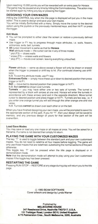 Shakermaker303: "Damals war Horace für mich ein laufender Hintern mit Beinen :-) Konnte dem Spiel zu seiner Zeit nicht sehr viel abgewinnen, doch nun finde ich es ganz passabel für ein Game aus 1983. Die Spielfigur ist nicht zu langsam und nicht zu schnell, lässt sich gut kontrolliert durch die Schluchten manövrieren. Sound und Musik ist toll, die hypnotische Hintergrundmelodie hat auch etwas. Es gibt sogar einen Level-Editor - noch nicht ausprobiert, gibt aber einen Plus-Punkt bei meiner Bewertung dazu. Dem Ersteller Stephan64 dieses C64 Wiki Artikels zum Spiel, gebührt ein Lob für die auführliche Beschreibung."