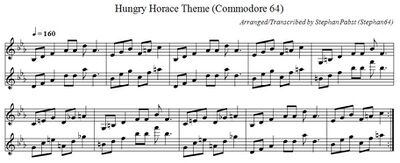 Die folgende Galerie zeigt die Begleitmelodie des Titelbildschirm und die Tonsequenzen beim Start des Spiels und beim Vertreiben eines panischen Wärters in der üblichen Notenschreibweise. Für eine kreative Weiterverwendung der Musikstücke stehen die Noten auch als PDF-Dokument (Datei:HungryHorace Theme PDF.pdf) und in der ABC-Musiknotation (Datei:HungryHorace Theme.abc.txt) zur Verfügung.
