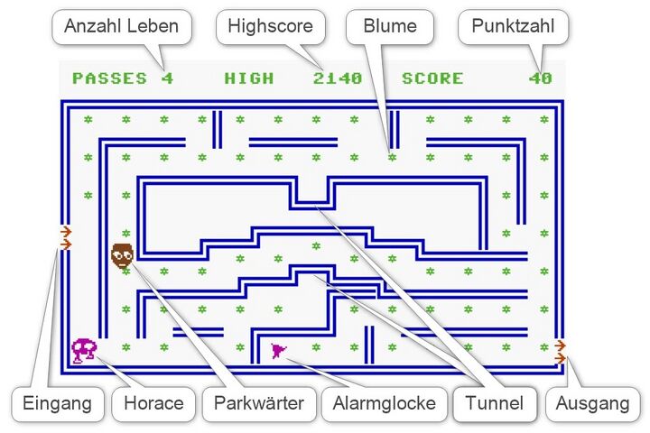 Die Bildschirmdarstellung findet ausschließlich im Monocolor-Textmodus statt (Video-RAM an Adresse $A000, Zeichensatz ab $A800). Horace und die bis zu vier Parkwärter sind Sprites, alle anderen grafischen Elemente sind Teil der Textdarstellung. Für die Erkennung, ob Horace mit einem Parkwärter in Berührung gekommen ist, verlässt sich das Programm auf die Sprite-Sprite-Kollisionserkennung des VIC (Register an Adresse $D01A); lediglich Zusammentreffen in den Tunnels, die es an einigen Stellen in den Parks gibt, werden per Software erkannt.
