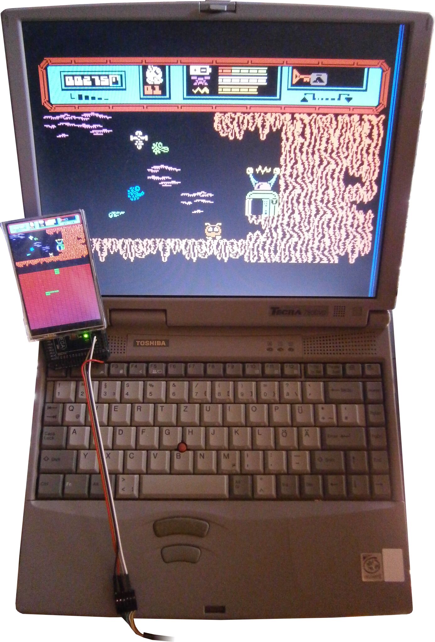 Kopplung meines C64-Emulators mit einem Arduino Mega 2560 über eine serielle Schnittstelle. Der TFT-Bildschirm zeigt in der oberen Hälfte den Bildschirminhalt des C64, unten eine Karte mit den im Spiel Starquake bereits besuchten Räumen (grün) bzw. noch nicht besuchten Räumen (rot).