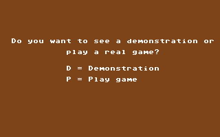Nach dem Start des Programms ist zu entscheiden, ob man zunächst eine Demo anschauen oder direkt spielen möchte: Taste (D lässt die Demo ablaufen, während P das Spiel startet (linke Illustration der nachfolgenden Galerie; die Demo ist ale erste Illustration im Abschnitt "Beschreibung" zu finden).