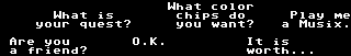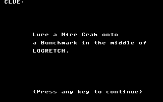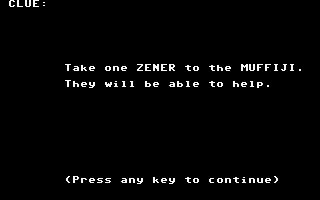 25500bzw.25550Unterprogramme für das Lesen dieser Informationen bei Programmstart und für das Schreiben ihrer eventuell geänderten Werte vor dem Wechsel zu einem anderen Programmteil. - Serielle Dateien mit Texten, die im Speicher keinen Platz mehr gefunden haben, beispielsweise die Datei "ADVICE" mit Onkel Smokes Ratschlägen oder "ITEMS" mit der Beschreibung seiner Reisemitbringsel. Auch ein eventuell gespeicherter Spielstand und ein selbst komponiertes Musikstück finden sich als serielle Dateien mit den Namen "SAVE.1" bzw. "SAVE.2" und "SONG.1" bzw. "SONG.2" (für Spieler 1 bzw. Spieler 2) auf der Diskette.