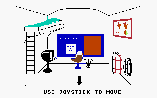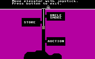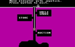 Solange die auf diese Weise verdienten Chips noch nicht ausreichen, kann man Onkel Smoke bis zu 43 weitere Male besuchen und die von ihm erhaltenen Kostbarkeiten jeweils wieder versteigern. Mit den so verdienten Chips geht der Spieler schließlich in das Warenhaus "Galactic Store" und kauft dort Ausstattungsgegenstände für den B-Liner (rechte Animation). Hierfür geht man durch Auf- und Abbewegung des Joystick zunächst ein Stück weit in das Kaufhaus hinein und biegt dann durch eine Auslenkung nach links oder rechts in einen der Gänge ein. Nun ist am unteren Bildschirmrand der Einkaufswagen des Spielers zu sehen, der vor einem Regal mit Waren (symbolisiert durch ihre Bezeichnungen) nach links und rechts verschoben werden kann. Stellt man den Einkaufswagen direkt (mit dem Haltegriff knapp rechts vom letzten Buchstaben) unter eine Artikelbezeichnung und betätigt dann den Feuerknopf, zu kann man den Kauf des entsprechenden Artikels durch einen Druck auf die Taste "Y" bestätigen — aber natürlich nur, sofern die als Zahlungsmittel dienenden grünen Chips für die Bezahlung ausreichen. Über den mit "EXIT" bezeichneten Ausgang geht es dann in den zentralen Gang des Geschäfts zurück, und — wenn alle Einkäufe erledigt sind — von dort aus durch Bewegung des Joysticks nach oben oder unten wieder in den Aufzug.