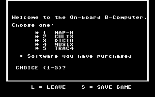 Der momentane Spielstand lässt sich vom Hauptmenü des im B-Liner installierten B-Computers aus mit Hilfe der Taste S abspeichern (rechte Illustration). Bei nachfolgenden Starts des Spiels wird man dann jeweils gefragt, ob man ein neues Spiel starten oder stattdessen diesen Spielstand wiederherstellen möchte. Die erste und die letzte Animation von Phase 2 im Abschnitt "Hinweise" zeigen das hierfür nötige Umsteigen in den B-Liner und das Einloggen am B-Computer.