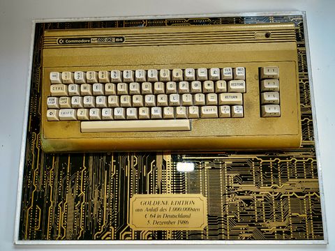 Ich hatte 1986 die erste eigene Wohnung und war deshalb notorisch pleite, ganz normaler Zustand für einen 19jährigen mit Volontärs-Gehalt. Die Einladung zu der Jubiläumsfeier von Commodore in München, wir hatten in der Redaktion drei davon bekommen, wenn ich mich richtig erinnere, war deshalb genau mein Ding. Gutes Essen für lau, perfekt. Hab ich also gleich den Finger gehoben, denn unser damaliger Chefredakteur hatte abgesagt. Warum weiß ich nicht mehr. Vielleicht keine Lust, vielleicht ein anderer Termin. Also mit zwei Kollegen dort hin, einen schönen Abend machen. Dass jeder von uns plötzlich einen Jubiläums-C64 in die Hand gedrückt bekommt, kam komplett unerwartet, davon wusste vorher niemand. Wir waren satt, nicht mehr ganz nüchtern und hatten jeder einen goldenen C64.