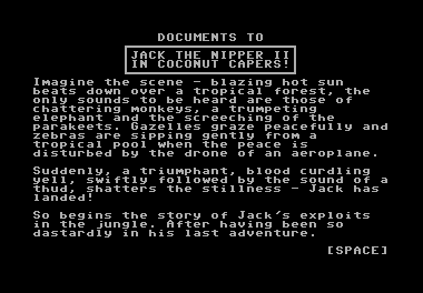 Jack the Nipper 2 ist ein Jump'n'Run Spiel. Der Hauptdarsteller dieses Spiels the Nipper, ein kleines freches gewindeltes Baby mit einer coolen Sonnenbrille, der sich im Dschungel befindet und dem verschiedene Abenteuer erwarten.