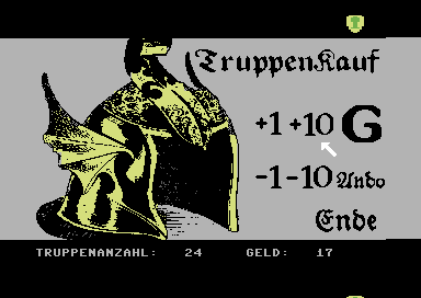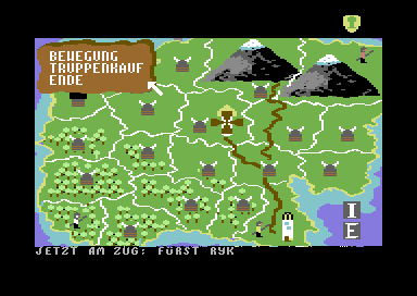 Man muss beim Bewegen der Truppen, aber auch beim Truppenkauf sehr genau die Wappen bzw. Zahlen treffen und anklicken, was manchmal etwas nervenraubend sein kann. Mit Klick auf "E" (Exit) gelangt man in der Karte aus dem jeweiligen Menu wieder heraus. Mittels Klick auf "I" erhält man (recht spärliche) Informationen über ein Gebiet.