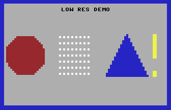 100 COLOUR 6,15:PRINT CHR$(147) 110 CENTRE "LOW RES DEMO" 120 REM *** ROTER KREIS 130 LOW RES 10,2 140 CIRCLE 10,25,10,10,1 150 PAINT 10,25,1 160 REM *** WEISSE PUNKTE 170 LOW RES 10,1 180 FOR X=27 TO 41 STEP 2 190 FOR Y=16 TO 35 STEP 3 200 PLOT X,Y,1 210 NEXT Y,X 220 REM *** BLAUES DREIECK 230 LOW RES 10,6 240 LINE 50,35,70,35,1 250 DRAW TO 60,15,1 260 DRAW TO 50,35,1 270 PAINT 60,30,1 280 REM *** GELBES "!" 3X HOCH 290 LOW RES 10,7 300 CHAR 70,15,33,1,3 310 REM *** ENDE 320 WAIT 198,255:PRINT AT(0,20)""