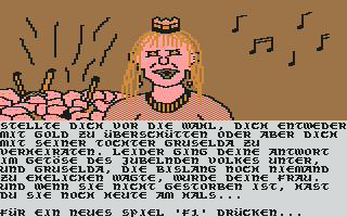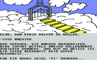 SYS 64738ausschalten !!! (da sonst kein Spielstand gespeichert werden kann) LOAD "*",8,1RETURN- Titelgrafik mit F1 verlassen