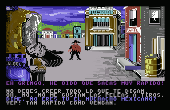 Eh, Gringo, I heard you got a fast draw! >Say, aren't you the mexicali kid?< Si, some call me that. >There's a price on your head, I bet!< Si. But you will never take me alive! >Drop your gun or else!< No!