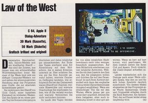 Wenn man Law of the West (kurz: LOTW) heute auf einem Emulator spielt, ist schnell ein alter Spielstand wiederhergestellt - aber 1985/86 war es eine Tragödie, wenn man erschossen wurde! Mit Diskette wenden und mindestens 5 Minuten Wartezeit, bevor es wieder los ging...