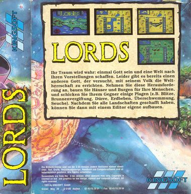 Das Geschehen beim Spiel Lords wird in der Draufsicht gezeigt, und nicht, wie bei Populous, isometrisch. Die Übersichtskarte findet man links oben. Das Spiel selbst verwendet nur den kleinen Ausschnitt in der Mitte des Bildschirms, in dem über die Landschaft gescrollt werden kann. Es gibt 60 verschiedene Karten mit eigener speicherbarer Highscoreliste. Mit dem eingebauten Leveleditor können neue Karten erstellt und gespeichert werden. Es gibt nur Soundeffekte, auch ein Intro-Stück fehlt.