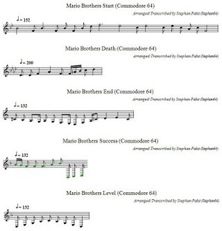 Die musikalische Untermalung besteht aus einigen kurzen, einstimmigen Sequenzen, die verschiedene Ereignisse (Spielstart, Verlust eines Lebens, Spielende, Beseitigen aller Gegner, nächstes Level) untermalen. Das nachfolgende Bild diese Melodien in der üblichen Notenschreibweise. Für eine kreative Weiterverwendung stehen die Noten auch als PDF-Dokument (Datei:MarioBros Theme PDF.pdf) und in der ABC-Musiknotation (Datei:MarioBros Theme.abc.txt) zur Verfügung.