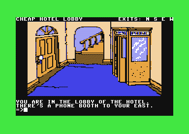 FRISK BODY, FLIP BODY, OPEN WALLET, OPEN CASE, GET CARD, GET DOLLAR, WEAR MASK, GET BOX, S, S, WAIT, N, E WAIT (x7), (..bis das Telefon läutet), ANSWER PHONE, SAY ZORCH, (stellen Sie sicher dass Sie sich das Passwort notieren, da es bei jedem Spiel verändert wird! Beispiele: "u6a" "w8b" "w6h"), WAIT, WAIT, PRESS BUTTON, (Sie befinden sich nun im Untergeschoss des Motels, die Telefonzelle ist ein Aufzug), E, E, N, TAKE BRA, S, W, S, GET BOOK, W, S, S, W, (*Bild "pic43.prg", dass das Spiel abstürzen lässt wurde ersetzt (leider defekt), dieses Bild zeigt einen Gang mit einem Loch in der Decke), MOVE BLOCK, USE CORKSCREW, CLIMB UP,