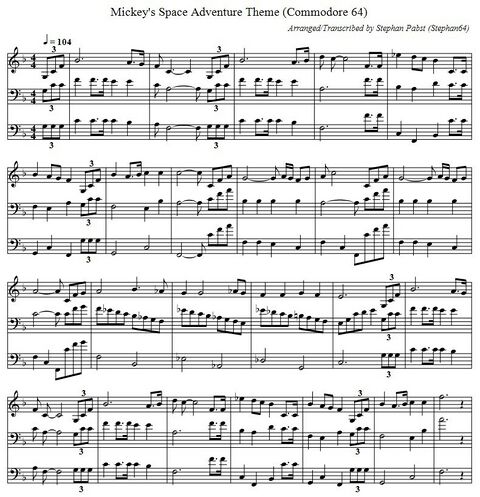 Das nachfolgende Bild zeigt die Titelmusik in der üblichen Notenschreibweise. Für eine kreative Weiterverwendung der Melodie stehen die Noten auch als PDF-Dokument (Datei:MickeysSpaceAdventure Theme PDF.pdf) und in der ABC-Musiknotation (Datei:MickeysSpaceAdventure Theme.abc.txt) zur Verfügung.