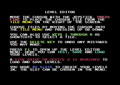 Mit dem integrierten Level Editor können eigene Rätsel entworfen und gespielt werden. Dafür stehen 20 Slots zur Verfügung. Die Levels können ausschließlich auf Diskettenlaufwerk 8 gespeichert und später wieder von dort geladen werden.