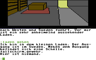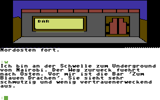 - die Bar: BAR GEHEN, MANN UNTERSUCHEN (der Typ braucht 2x Schnaps), SCHNAPS KAUFEN, SCHNAPS NEHMEN, SCHNAPS GEBEN, SCHNAPS KAUFEN, SCHNAPS NEHMEN, SCHNAPS GEBEN, SCHNAPS KAUFEN, SCHNAPS NEHMEN, W, O, NORDOSTEN, N,