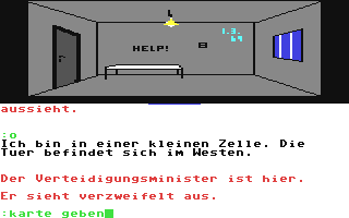- der Bahnhof: BAHNHOF GEHEN, O, O, SCHLIESSFACH OEFFNEN, 0275, SCHLUESSEL LEGEN, ANWEISUNGEN NEHMEN, ANWEISUNGEN LESEN (US-Verteidigungsminister von Rebellen nach Kenia entführt, Position in Karte eingezeichnet, in der Nähe des HQ ist Flughafen, dieser nur 1x benutzbar, wenn Minister befreit Signal mit CB-Radio senden, nach 30 min wird Flugzeug nördlich von HQ landen und nach 10 min wieder starten), ANWEISUNGEN LEGEN, LANDKARTE NEHMEN, LANDKARTE LESEN (Punkt ist markiert, Koordinaten sind "5.5 S / 33.2 O"), LANDKARTE LEGEN, SW, SCHNAPS GEBEN, SCHERE NEHMEN, NW, W, SW, N, SW,
