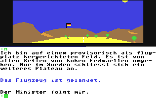 - wieder am Flugfeld: (im Besitz sollte sein: Uhr, Fallschirm, Essen, Schere, ID-Karte), FLUGZEUG GEHEN, MANN ZUHOEREN, MANN REDEN, 5.5, 33.2, AUSGANG ZIEHEN, FALLSCHIRM TRAGEN, CB NEHMEN, AUSGANG GEHEN