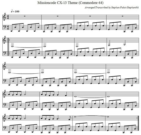 Das nachfolgende Bild zeigt die Titelmelodie in der üblichen Notenschreibweise. Für eine kreative Weiterverwendung stehen die Noten auch als PDF-Dokument (Datei:MissioncodeCX13 Theme PDF.pdf) und in der ABC-Musiknotation (Datei:MissioncodeCX13 Theme.abc.txt) zur Verfügung.