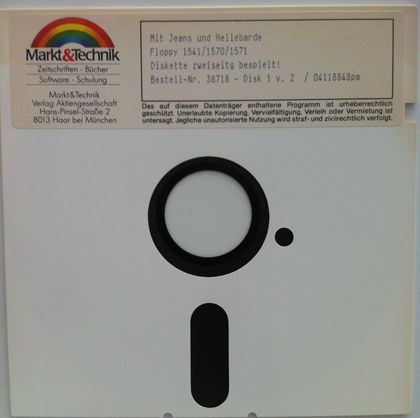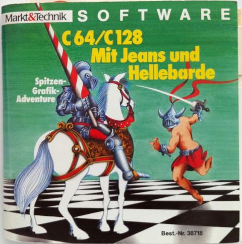 Das Adventure Mit Jeans und Hellebarde wurde vom Verlag Markt & Technik publiziert. Es bietet lange und teils sehr ausführliche Ortsbeschreibungen. Die Multicolor-Begleitgrafiken sind meist sehr gut gelungen. Es wird nach jeder Eingabe von Diskette nachgeladen. Die Ladezeiten sind häufig sehr lang. Das Spiel wurde anscheinend nicht komplett fertig programmiert - es scheint an einigen Stellen unvollendete Subquests zu geben. Eine Menge Rote Heringe können im Verlauf des Abenteueres gefunden werden. Der Parser ist an den meisten Stellen auf einfache Eingaben ausgelegt. Vereinzelt ist der Eingabeinterpreter aber auch arg pingelig und aktzeptiert nur eine bestimmte Syntax. Die Vokabelliste besteht samt Richtungsbefehlen zwar aus etwa 1000 Wörtern, davon wiederholen sich aber Unmengen in der Schreibweise. Bei der Zählung wird jede einzelne Variante gewertet. Man wollte aus Marketinggründen wohl unbedingt die 1000-Wort-Grenze erreichen. Für das Spiel relevant ist nur ein Bruchteil davon. Bei einigen Rätseln wäre es schön gewesen, wenn alternative Lösungs-Befehle eingebaut worden wären. Oft hakt man bei der Suche nach der richtigen Syntax, um den vermuteten und richtigen Weg durchs Spiel zu gehen.