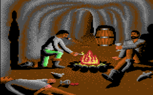 Warte, Warte (Man bekommt einen scharfen Knochen an den Kopf geworfen), Zerschneide die Fessel mit dem Knochen, Warte (solange bis in der Hohle eine feuchtfröhliche Stimmung einkehrt, meistens 2x), O, Schau in den Sack (in den Sack der Räuber), Nimm die Flasche, W, W, H, Loese Seil, W, S, O, Betrachte das Boot, Schau in den Seesack, Verklebe Boot mit Kaugummi,